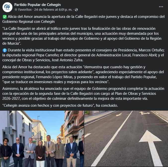 COMPARECENCIA SOBRE LA SITUACIÓN DE LA CALLE BEGASTRI. En mayúsculas y con un punto colorado 🔴. Que van a pedir un pleno extraordinario para hablar del tema, que exigen la comparecencia de la alcaldesa y del concejal de obras y servicios, una comisión de investigación porque ‘de los errores se tiene que aprender’ (salvo si eso mismo lo pedimos los demás en otros ámbitos) y la dimisión del concejal pendiente de ser reprobado.