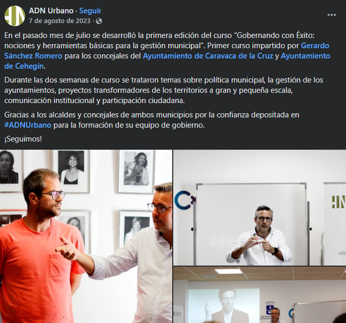 En julio de 2023, menos de un mes después de tomar posesión del cargo, todos los miembros del equipo de gobierno participaron en la 1ª edición del curso ‘Gobernando con Éxito: nociones y herramientas básicas para la gestión municipal’ junto a miembros del PP de Caravaca.