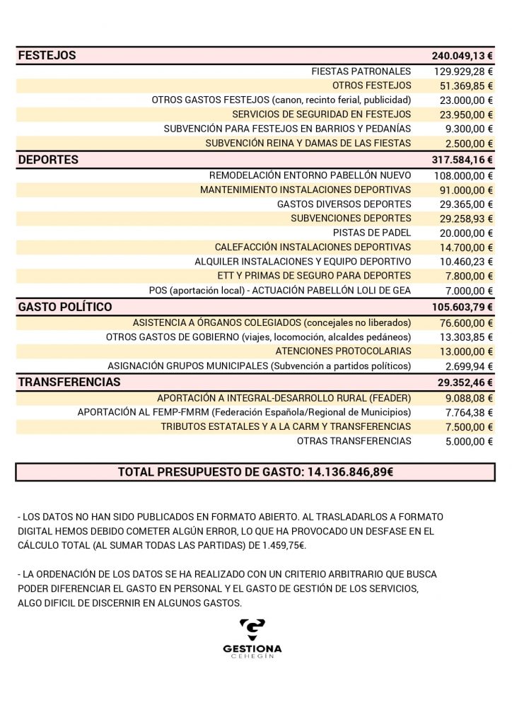 – Los datos no estaban en formatos abiertos. Los errores en la transcripción y ordenación de cifras han provocado un error acumulado de 1.459,75€ respecto al presupuesto total oficial.